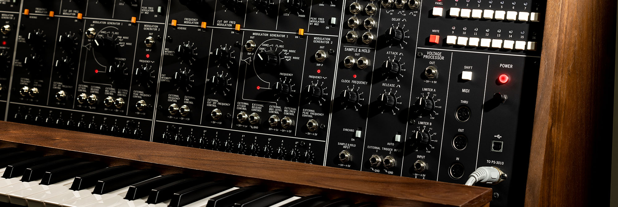 The new PS-3300 delivers an astonishingly rich sound - equivalent to 144 MS-20 units - while remaining true to the architecture that defined the original. At its core are three PSU-3301 sound generator units, just like the PS-3100. Each unit includes a VCO, VCF, VCA, and EG, plus powerful modulation tools: two LFOs (modulation generators), three voltage-controllable bandpass filters (resonators), and 12 independent tuning knobs for microtuning - an expressive capability only possible with fully polyphonic synthesizers.