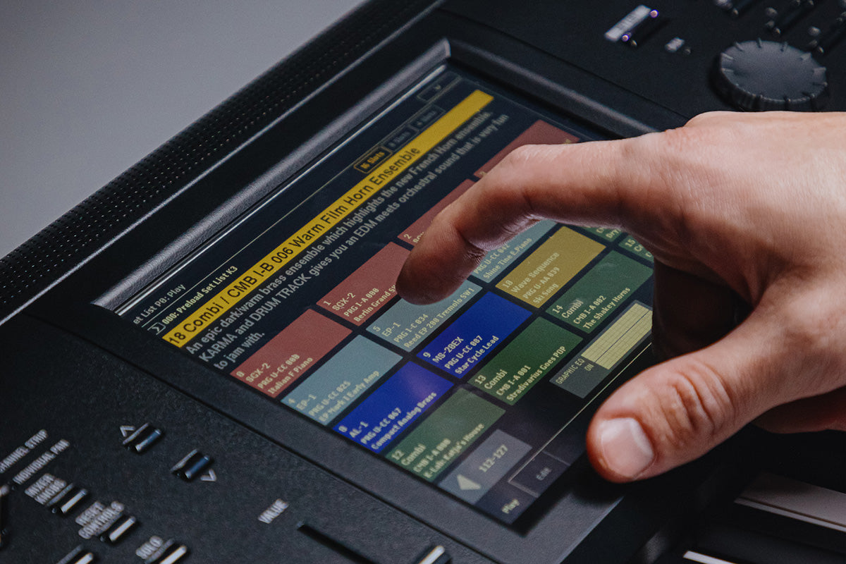 KRONOS can organize all of the resources you need to get through a song—or a set—using the Set List mode. Using the Set List mode, the TouchView display can host 16 color-coded touch-screen buttons; each one can instantly call up the appropriate Preset, Combination, or Sequence—regardless of mode!
